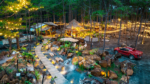 Chợ nằm dưới những tán thông xanh mát tại khuôn viên đồi thông gần quảng trường trung tâm. Không gian ở đây gồm các gian hàng được làm từ tre, gỗ, nứa, mang đậm bản sắc văn hóa địa phương.