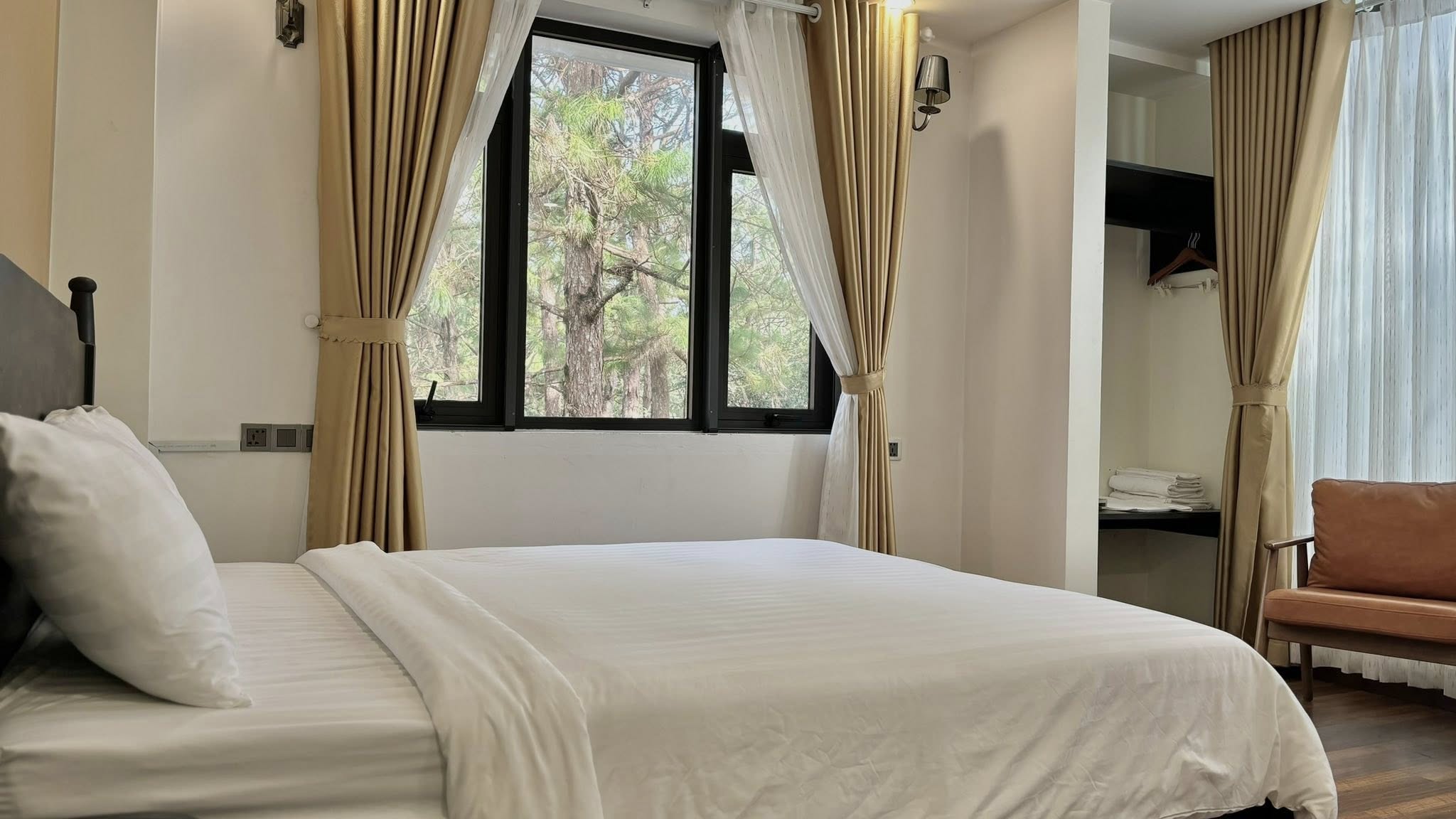Điều làm nên sức hút đặc biệt của Saclly Măng Đen chính là không gian xanh mát, hài hòa với thiên nhiên. Khách sạn được bao bọc bởi những khu vườn cây xanh mướt, mang đến một bầu không khí trong lành, dễ chịu. Mỗi phòng nghỉ đều được trang bị ban công hoặc sân hiên riêng, nơi bạn có thể thư thái ngắm nhìn khung cảnh rừng thông hùng vĩ, hít thở làn gió se lạnh đặc trưng của Măng Đen. Tưởng tượng mà xem, buổi sáng thức dậy với tách cà phê nóng hổi trên ban công, phóng tầm mắt ra xa ngắm nhìn những hàng thông reo trong gió, hay buổi chiều tà cùng gia đình, bạn bè thưởng thức trà ấm áp dưới ánh hoàng hôn – tất cả đều là những khoảnh khắc đáng giá mà Saclly Măng Đen mang đến. Không gian này thực sự lý tưởng cho những ai muốn tìm một nơi để đọc sách, thiền định hoặc đơn giản là hòa mình vào vẻ đẹp nguyên sơ của cao nguyên.